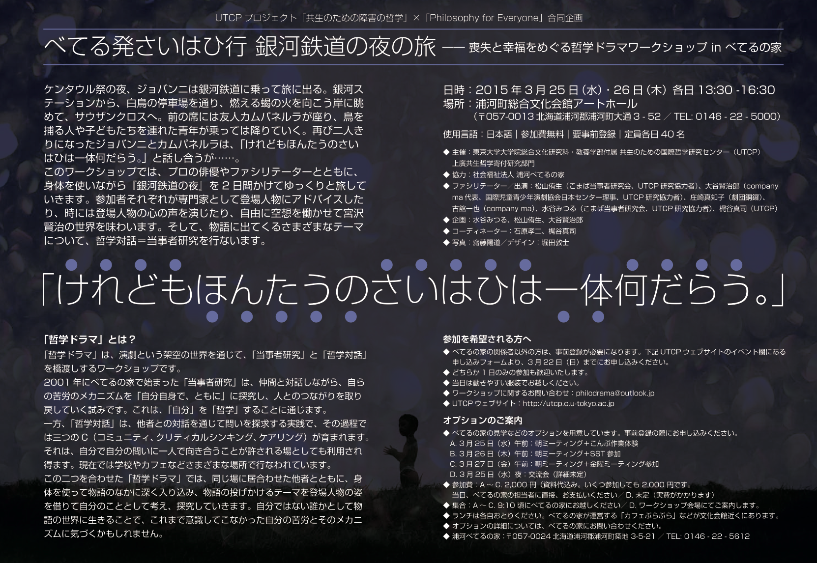 | グラフィック | べてる発さいはひ行 銀河鉄道の夜の旅――喪失と幸福をめぐる哲学ドラマ ワークショップ ポスター |